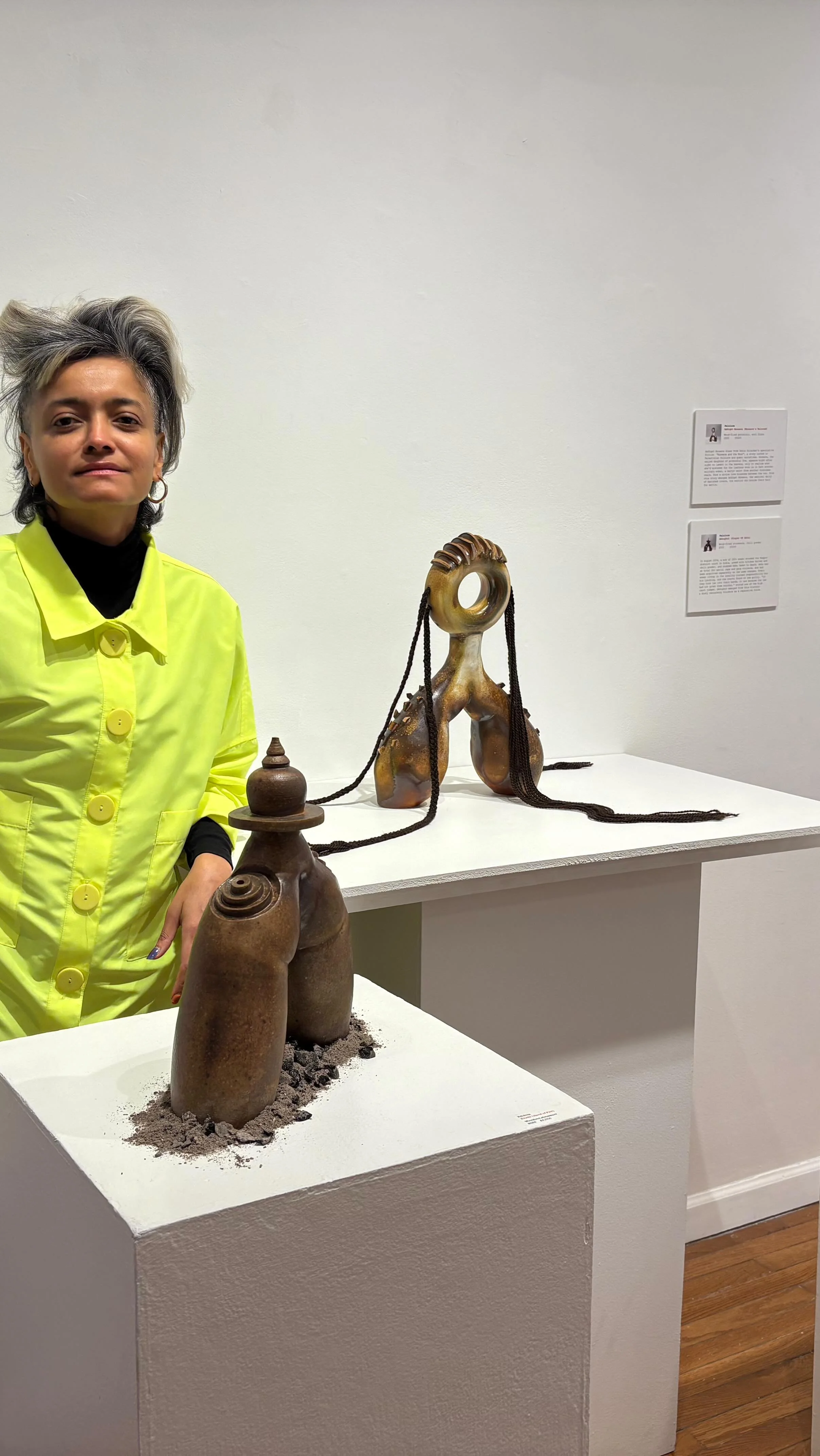 From far left: Rachel Dove, Deflection, 2025, ceramic stoneware, 10.5 in. x 6 in. x 4 in. Dan Munkus, Float, 2025, charcoal on paper, 30 in. x 22 in.