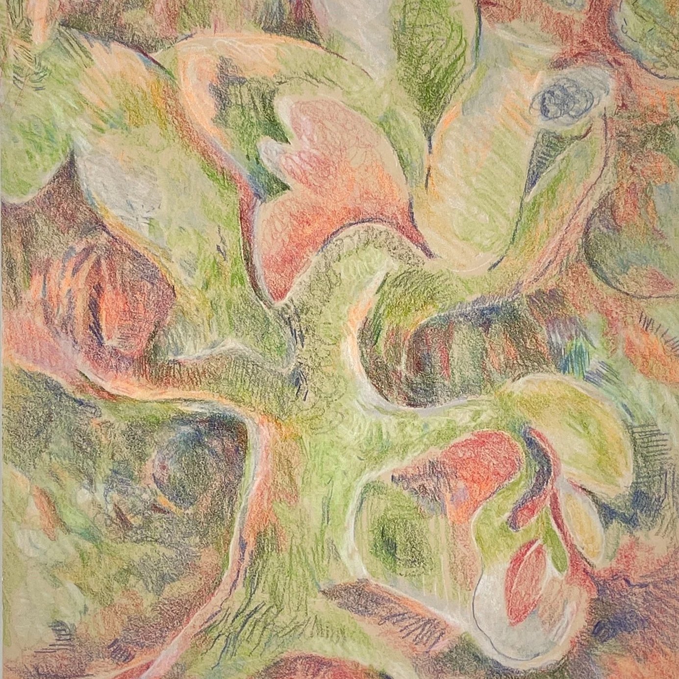 Above, from left: Nansi T. Lent, Whirlybirds Delight, 2026, archival print on aluminum, 12 in. x 12 in. Karen Allen, Day Dream Tree (detail), 2022, colored pencil on paper, 14 in. x 11 in. Robin Adler, Nightfall, 2023, encaustic on wood, 10 in. x 10 in.