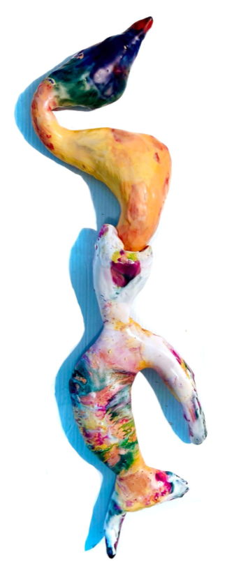 From left: Joan Harmon, Puโca, 2025, ceramic with encaustic surface, 20 in. x 5 in. x 2 in. Aubrey Roemer, Water in the Womb (detail), 2025, cyanotype and gouache on paper, 22 in. x 30 in.