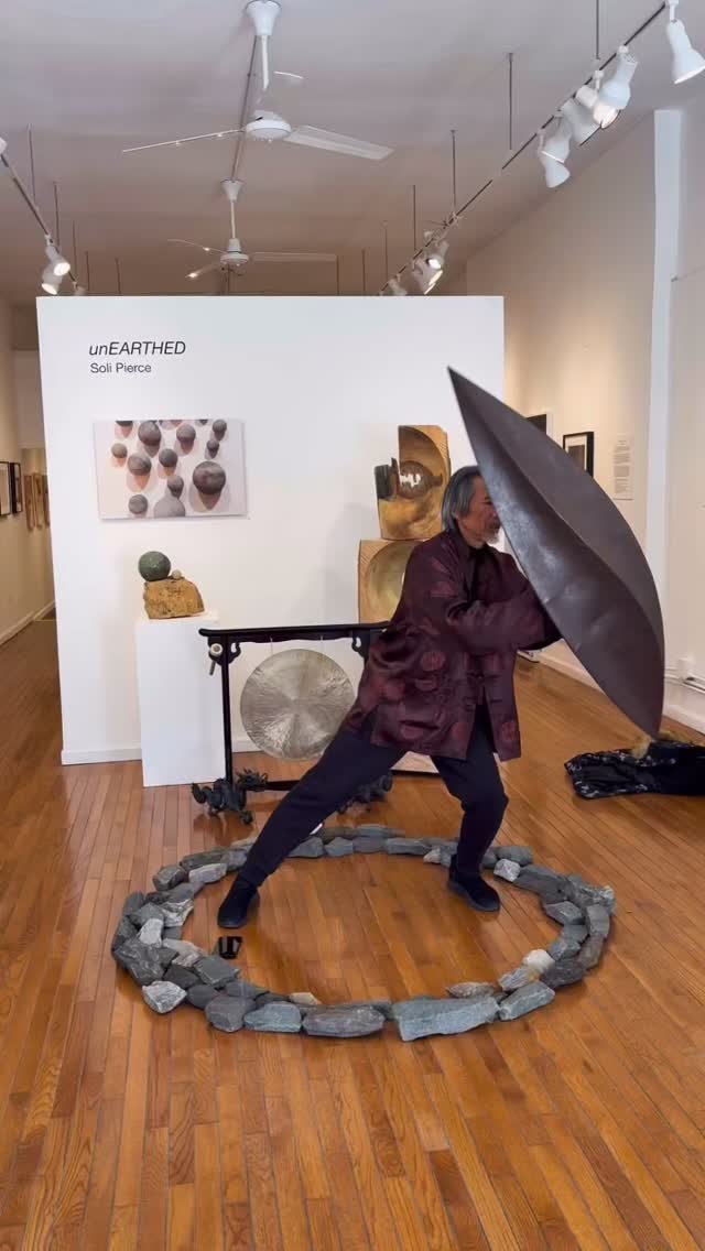 Joel Brown, Mesa Verde, 2025, wood-fired ceramic, 24 in. x 40 in. x 18 in. Alaina Enslen, Spinae, 2025, encaustic and fiber on cradled panel, 40 in. x 40 in.